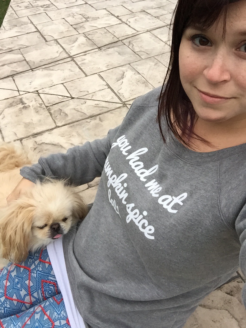Leggings and pumpkin spice sweatshirt make for a happy Audrey.